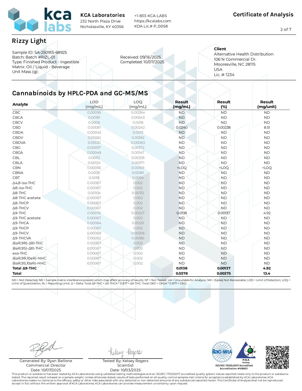 Nutrition label for RIZZY THC Lemonade Ice Tea showing 50 calories per 355ml serving with 12g added sugars. Includes organic ingredients and THC infusion.