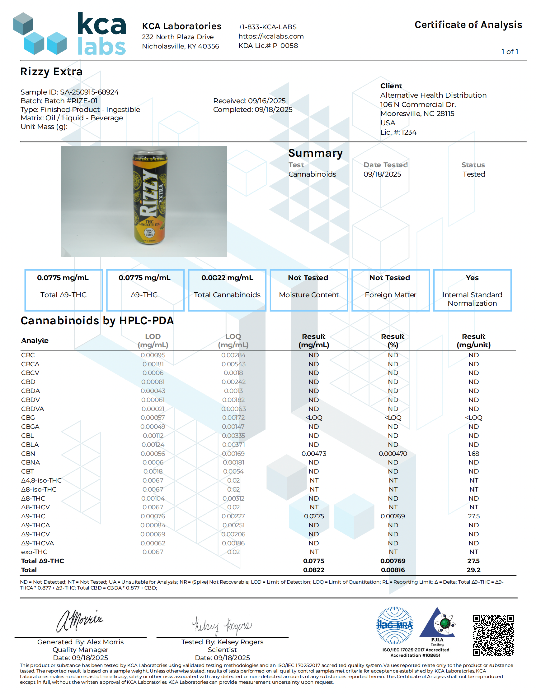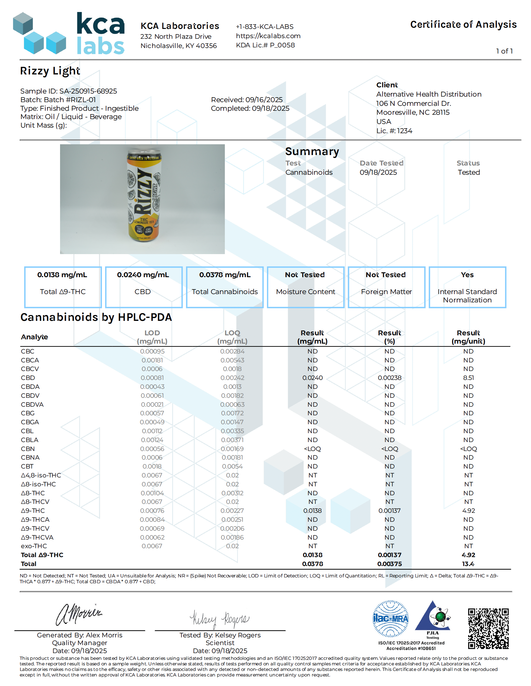 We are committed to transparency by providing detailed, clear label reports for every batch of our popular RIZZY THC Lemonade Tea Drink. Our customers can trust in the quality and safety of our products, knowing that we prioritize their well-being and satisfaction.